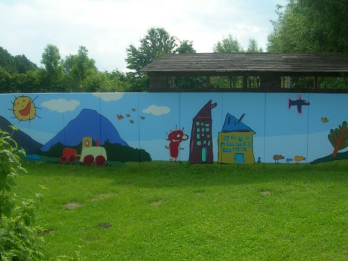 Unter fachkundiger Anleitung von Sebastian Bieler gestalteten die Kinder im Kinderdorf Steinbach in den letzten Wochen ein Wandbild am Ballplatz. Als Vorlage dienten unter anderem Bilder, die von Kinderdorfkindern in einem Malkurs entstanden sind. Das neue Wandbild setzt einen kräftigen und phantasievollen Farbakzent mitten im Kinderdorf.